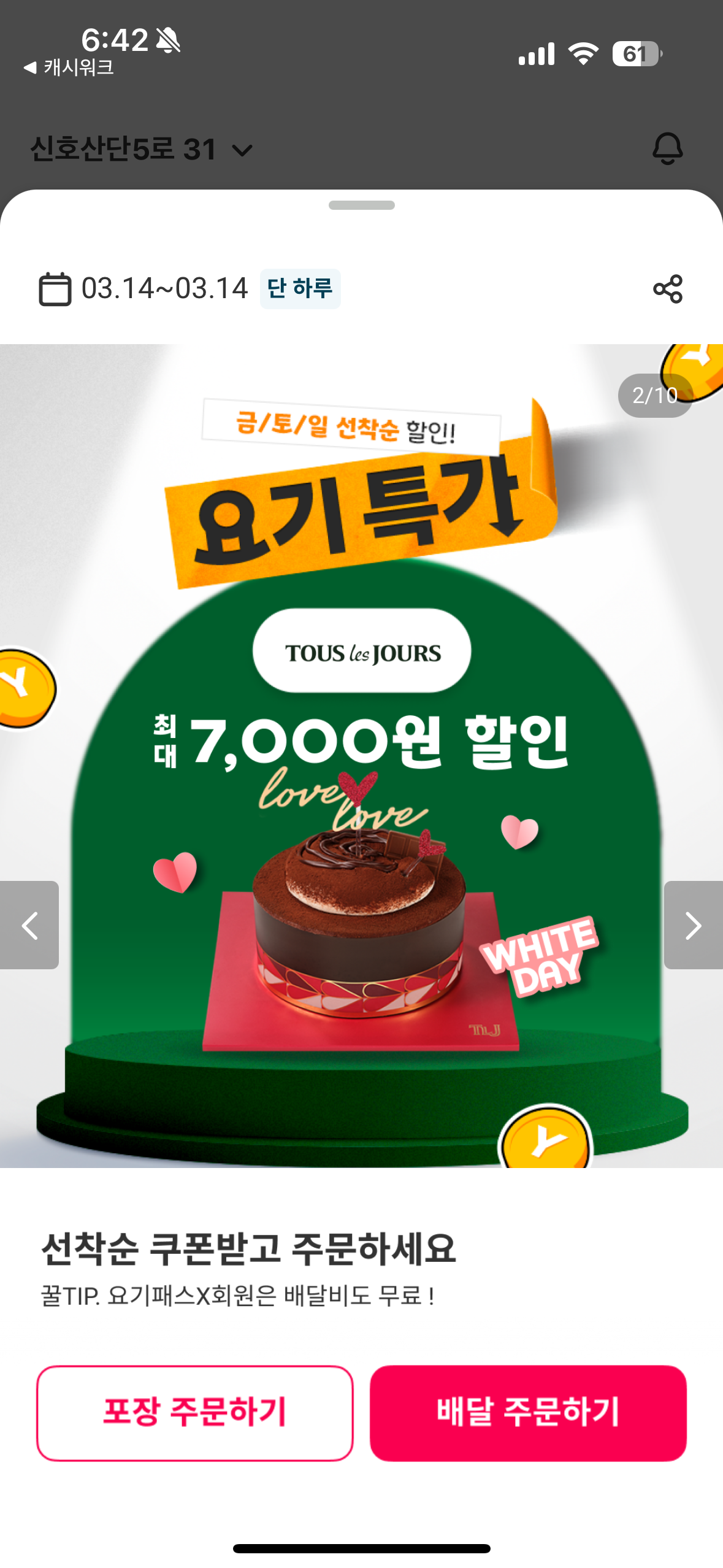 단 하루, OOOO 배달/포장 최대 7,000원 할인!
