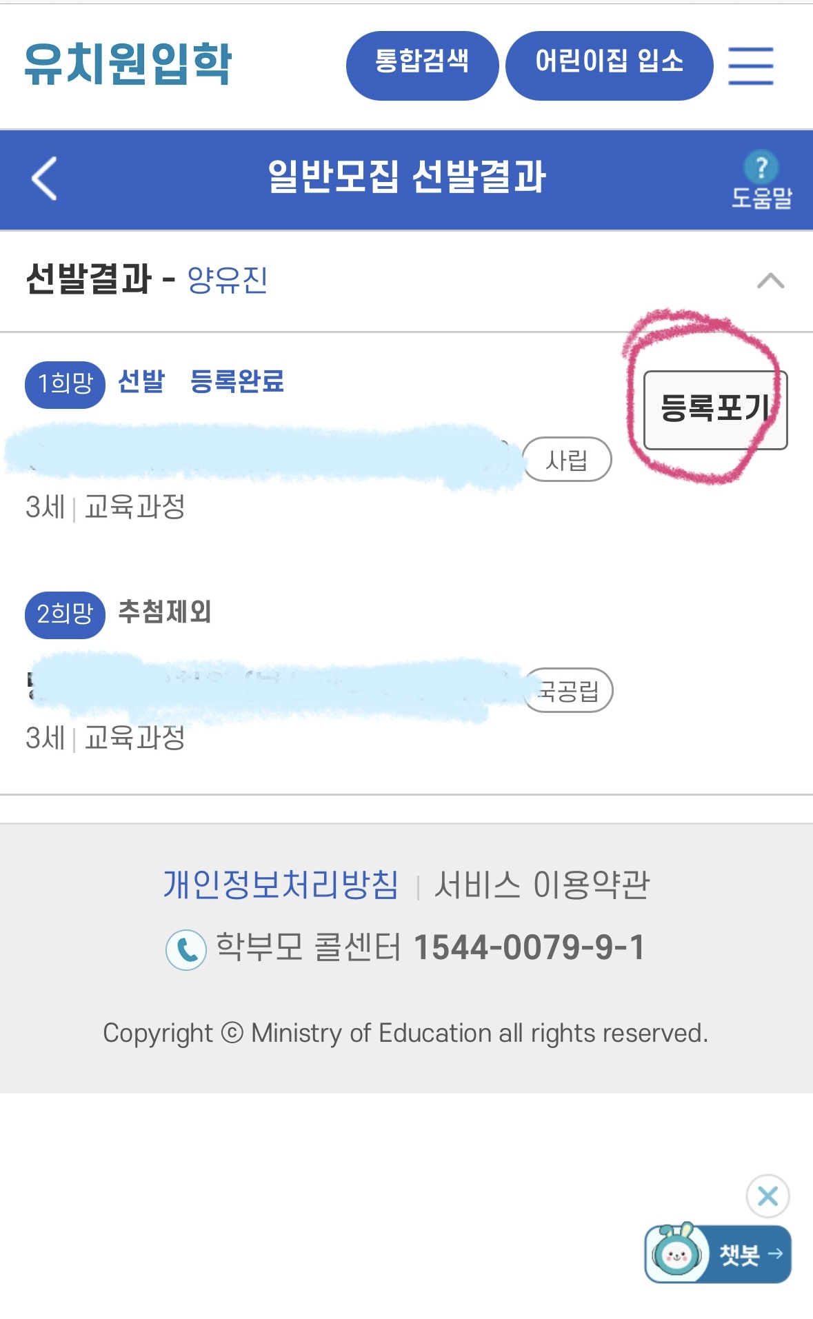 유치원의 이름과 등록포기 버튼이 나옵니다!