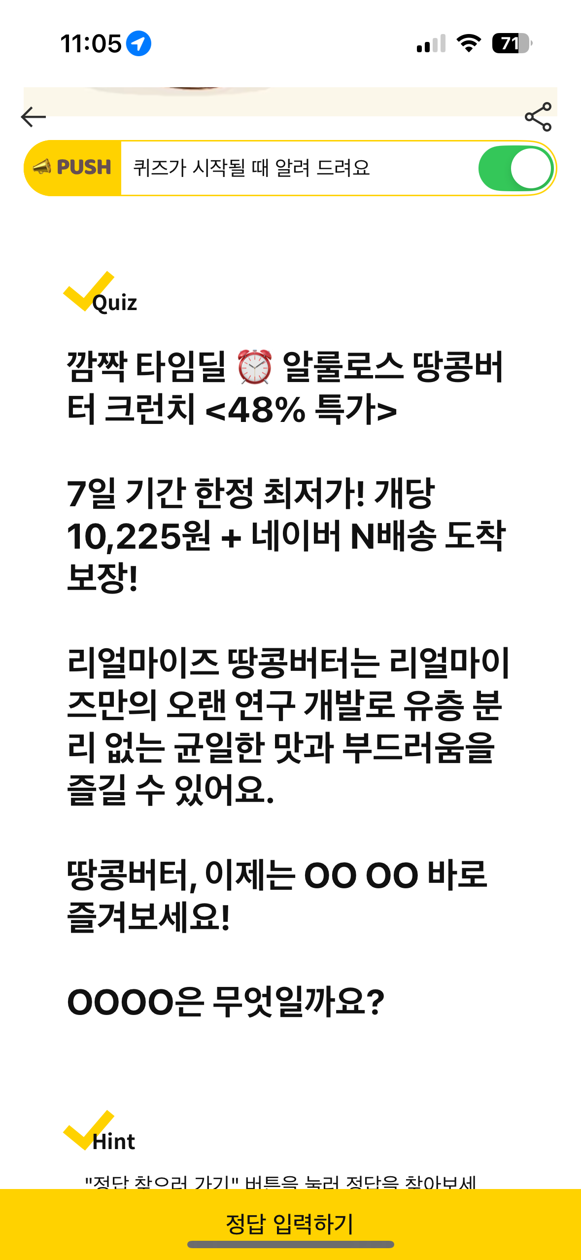 리얼마이즈 알룰로스 땅콩버터 크런치 캐시워크 돈버는퀴즈 문제 리얼마이즈 땅콩버터는 설탕 대신 0kcal 알룰로스로 단 맛을 유지했어요. 뿐만 아니라 팜유, 보존제 OOO OO 만들어 땅콩 본연의 맛을 느낄 수 있답니다! OOOOO은 무엇일까요?