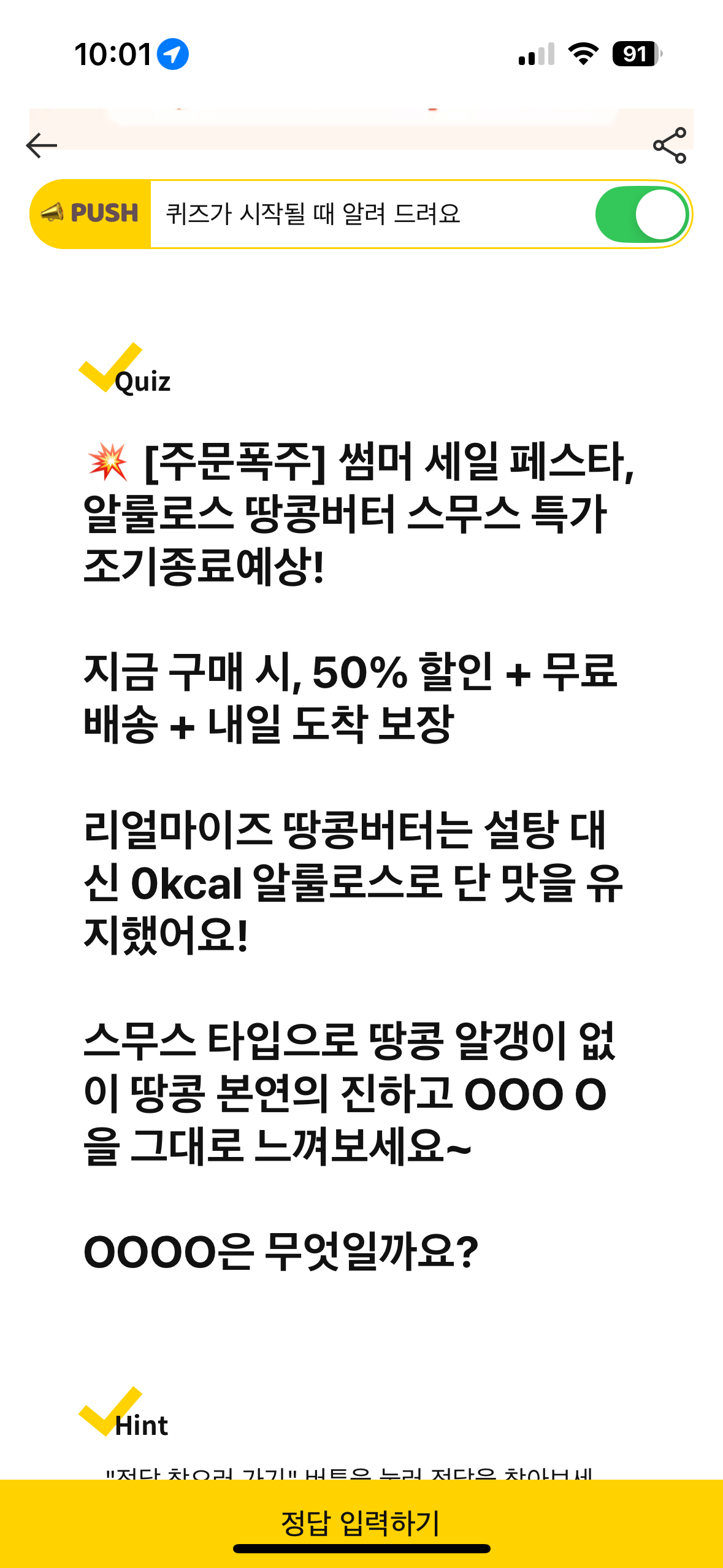 리얼마이즈 알룰로스 땅콩버터 캐시워크 돈버는퀴즈 문제 [주문폭주] 썸머 세일 페스타, 알룰로스 땅콩버터 스무스 특가 조기종료예상! 지금 구매 시, 50% 할인 + 무료배송 + 내일 도착 보장 리얼마이즈 땅콩버터는 설탕 대신 0kcal 알룰로스로 단 맛은 그대로, 맛과 건강 모두 챙겼어요. O OO OO 맛있는 땅콩버터를 찾는 분께 추천 드려요! OOOOO은 무엇일까요?