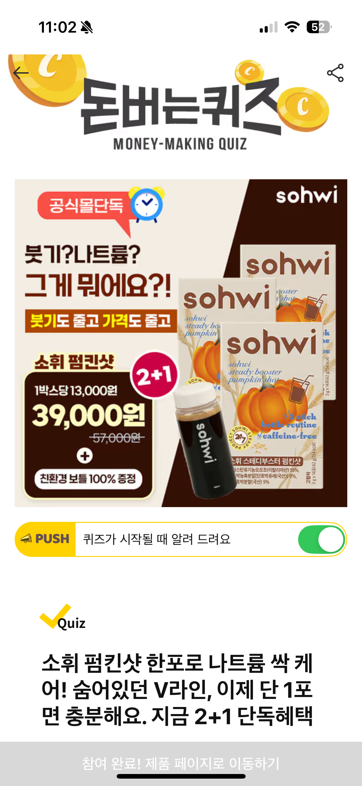소휘 펌킨샷 캐시워크 돈버는퀴즈 문제 소휘 펌킨샷 한포로 나트륨 싹 케어! 숨어있던 V라인, 이제 단 1포면 충분해요. 지금 2+1 단독혜택 칼륨이 풍부해 과하게 섭취한 나트륨, 수분은 빼고 풍부한 식이섬유는 보충해줘 V라인 관리에 좋은 소휘 펌킨샷! OO에서는 이미 아이들도 아침식사때 마시는 차 유기농 오르조 보리를 함께 담았어요. 무카페인 호박차로 손쉬운 관리 하세요. 여기서 OO은?